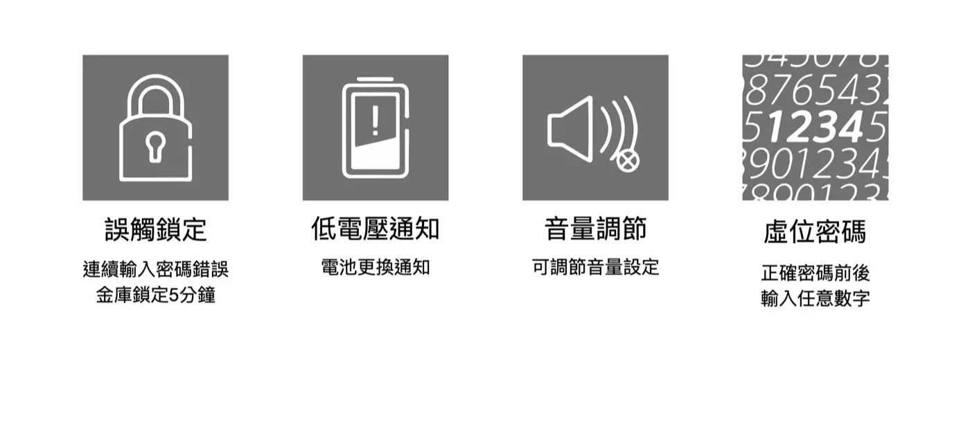 誤觸鎖定連續輸入密碼錯誤金庫鎖定五分鐘 低電壓通知電池更換通知 音量調節可調節音量設定 虛位密碼正確密碼前後輸入任意數字