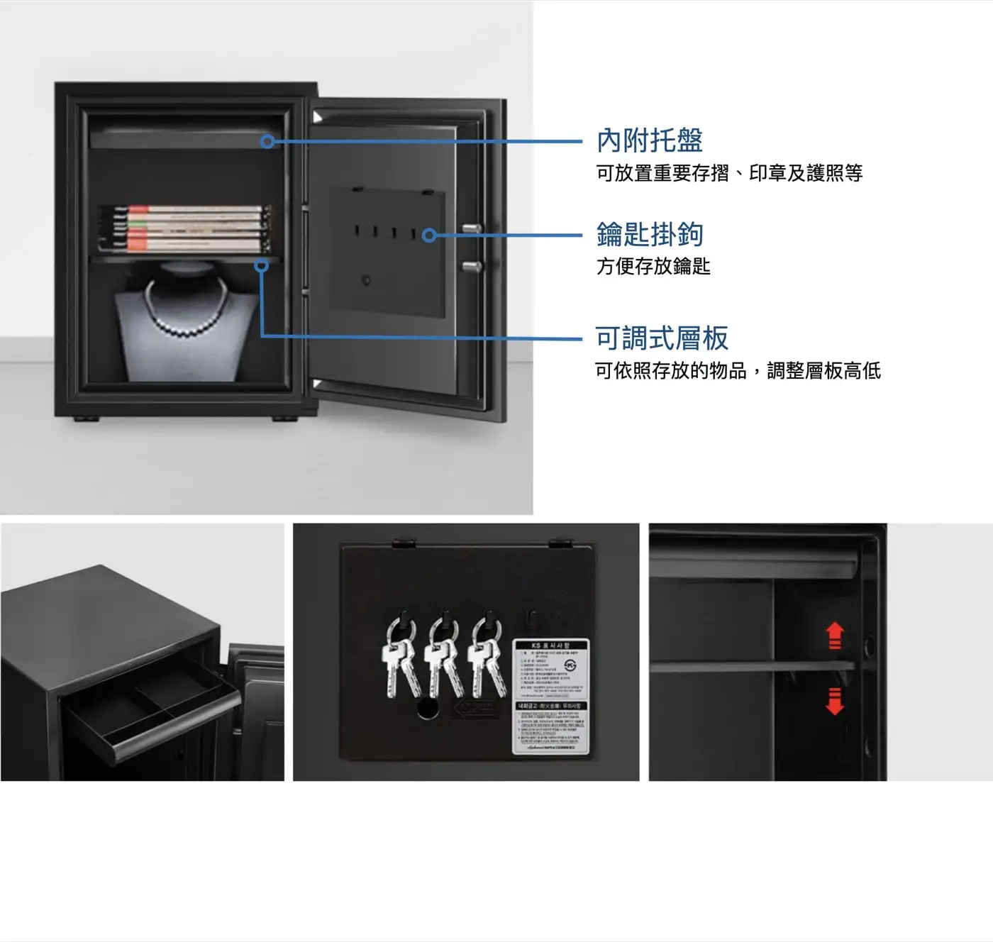 內附托盤可放置重要存簿、印章及護照等 鑰匙掛鈎方便存放鑰匙 可調式層板可依照存放的物品,調整層板高低